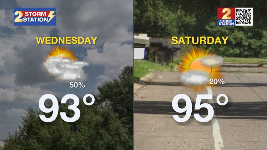 Today & Tonight: Wednesday starts off dry, warm, and muggy. Mainly to partly sunny conditions in the morning will help temperatures climb quickly into the low 90s, with feels-like readings peaking in the low 100s. By the afternoon, enough atmospheric moisture and a nearby disturbance will help trigger another scattering of showers and thunderstorms. Around 50% of the WBRZ coverage area can expect measurable rainfall on Wednesday afternoon. Overnight, skies will clear, and temperatures will drop back into the mid-70s.