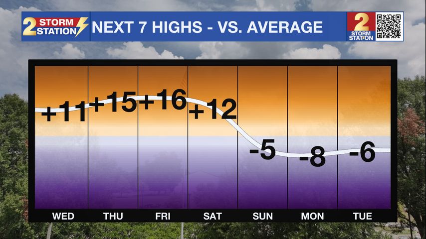 Up Next: The warming trend will only continue through the end of the week. Highs will get into the 80s Thursday, and stay well above average through Saturday. At the same time, showers will start to be possible as moisture levels rise. Only expect a few showers Thursday and Friday, with slightly better chances during the first half of the weekend. This is when a cold front will roll through, possibly even bringing a few storms. Temperatures will tumble after it passes.