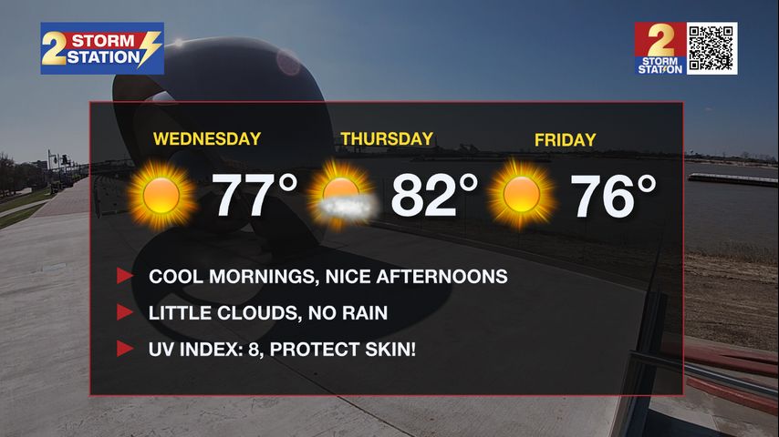 Weekend: This weekend's forecast is as close to picture-perfect as things get in South Louisiana. Cool mornings in the upper-40s to mid-50s will quickly warm near average each afternoon. Friday and Saturday will sport afternoon highs in the middle-70s, while Sunday may touch 80 degrees again. The air remains humidity-free, and even winds will stay in check, around 10 mph each day. For those heading out to the Ponchatoula Strawberry or French Quarter Festival this weekend, rain will not be around to interrupt your outdoor plans. However, it is encouraged to use sunscreen as the UV index continues to increase each day to avoid an unnecessary burn.