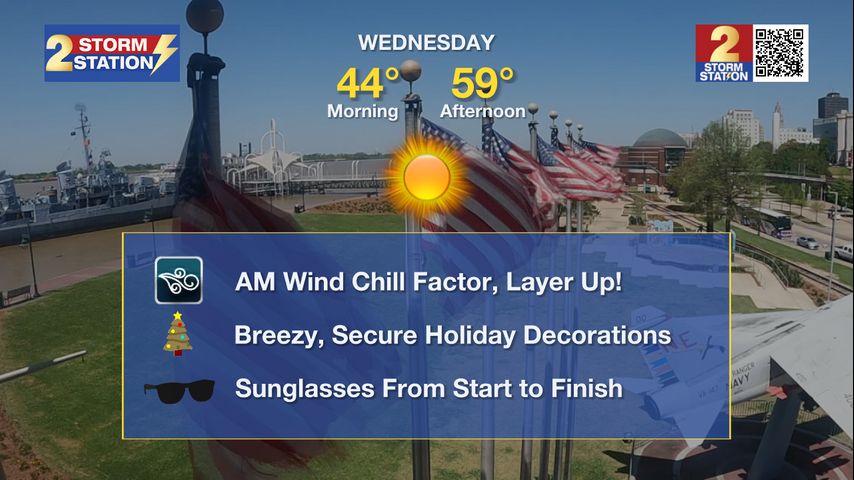 Today & Tonight: A few clouds may be around during sunrise but breezy winds out of the northwest will quickly clear them out and we will see full sunshine the remainder of the day. Wednesday morning will start off much cooler than the previous few, in the low to mid 40s around the Capital Area. Despite the sunshine, afternoon highs will only warm into the upper 50s, with the breeze making it feel a bit cooler. Overnight, clear skies will remain and the winds will lighten; this will allow temperatures to dip back into frost territory. Baton Rouge is expected to hit a low temperature near 36° early Thursday.