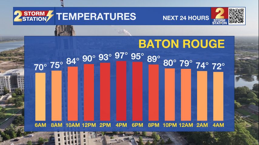 Today & Tonight: Low humidity and clear skies will allow Wednesday morning conditions to be quite comfortable. Temperatures near Baton Rouge will be in the 70's until around 9am when the sunshine will then begin heating the air quickly. Similar to Tuesday, afternoon highs will be hot, in the middle to upper-90's, but thanks to the lower humidity levels the heat index values will not move far from the thermometer's reading. Dry air will make for clear skies and no rain today and overnight. Lows early Thursday will again be refreshing, near 70°.