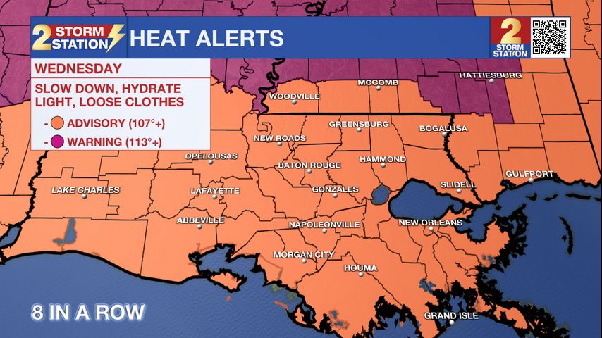 Today & Tonight: The entire WBRZ viewing area is under a HEAT ADVISORY from noon until 7pm this evening. Temperatures are starting off warm on this Wednesday morning in the low-80s. By the afternoon, temperature will climb near 100°, and this is exactly why we are now on day 8 of heat advisories for our area. Heat index values will be from 107-112° for several hours today. Be sure you re drinking lots of water and limiting your time outdoors. This summertime sizzler is not letting up just yet. Radar will stay quiet until the weekend.