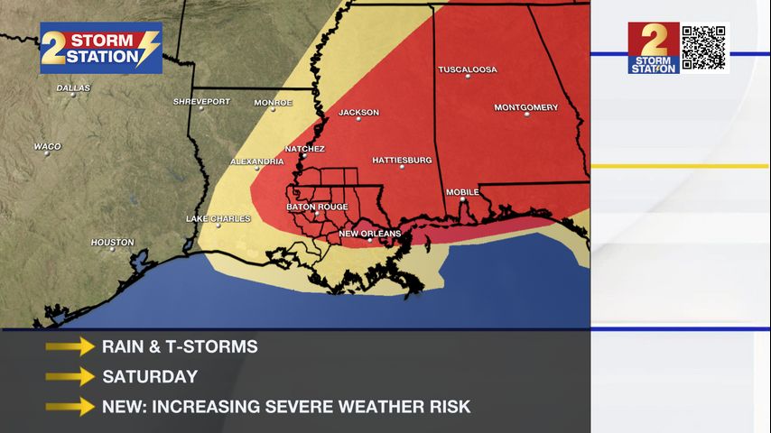 Saturday: A strong storm system will move in, bringing in more widespread rain and thunderstorms and, perhaps more notably, the possibility of severe weather. Both energy and winds in the atmosphere will increase, meaning we could see strong thunderstorms with all hazards such as wind, hail, and tornadoes possible. As of Wednesday morning, much of the WBRZ coverage area, including Baton Rouge, is now included in a greater chance for severe weather. The timing will be important to outdoor events such as the Wearin’ of the Green Parade, however, those details will not become clear until around Thursday.