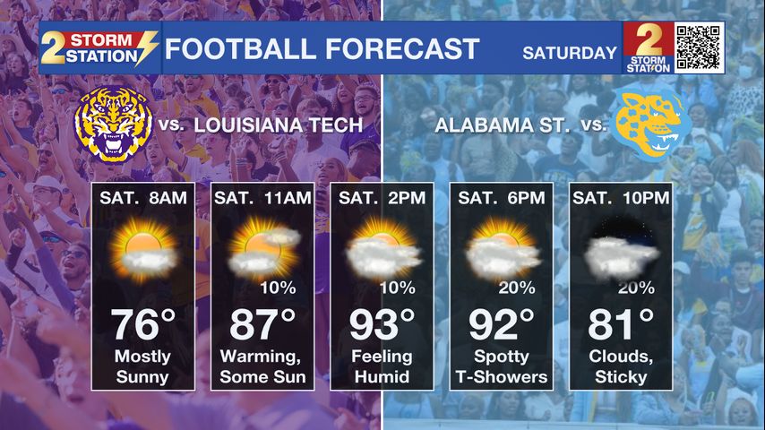 Up Next: Drier air will stay in place Thursday, leading to low humidity and no chance of rain. Enjoy it, because humidity values will begin creeping up Friday, and into the weekend. For LSU and Sothern's home games, expect humid conditions, and even the chance for some storms. A washout is not expected, but stay connected to the Storm Station for updates. Rain coverage looks to peak out Sunday, as moisture increases, and a front enters the region. Current guidance keeps this front north of the Capital Area, so expect an uncomfortable feel and the chance of storms into next week.