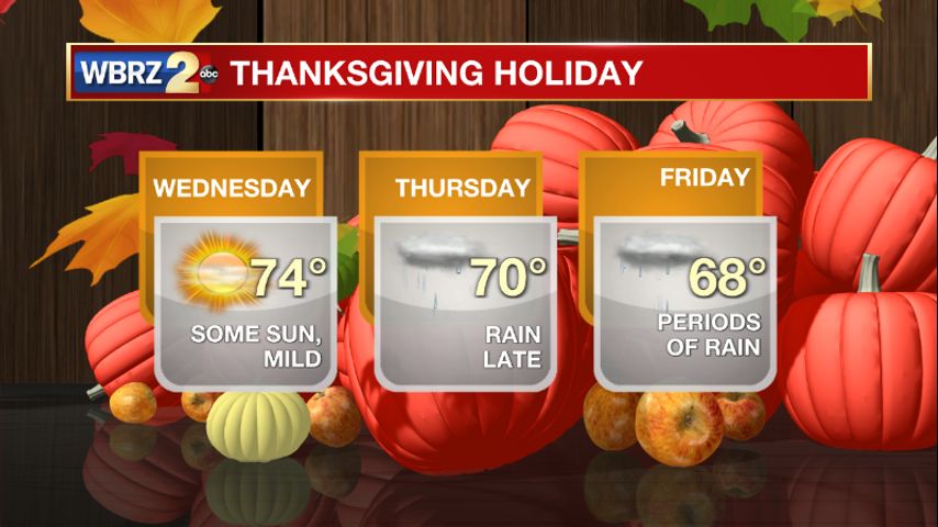 Up Next: Your Thanksgiving Day forecast will have some showers but not a total washout. You will be waking up with temperatures in the mid-50s with cloudy skies. It will be a muggy start but rain holds off until later in the day. Isolated showers are possible starting around lunch. The main line of showers and storms will move through later in the afternoon and into the overnight hours. Temperatures throughout the day will get near 70° in the afternoon hours. Overnight the showers and storms hang on and Black Friday will be starting wet. Friday will be rainy, with widespread showers for most of the day. Temperatures will get into the upper-60s if we get a good break in the cloud cover. The rain sticks around into Saturday’s forecast. Click here to see the 7-day forecast.