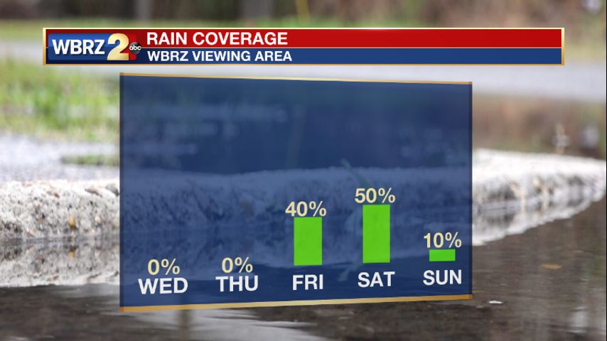 Up Next: Thursday will be a bit warmer with temperatures in the upper 70s and overnight temperatures will be in the mid-50s. The next chance for showers comes in with the next system on Friday. This system will bring a few rounds of rain and the overall timing may shift. If you have Friday and Saturday plans, stay connected with us. A few showers will move in on Friday afternoon. Showers will be more likely for areas south of Baton Rouge on Friday. Those showers are expected to fade out as they move from west to east. The system will likely continue to spark up a few showers overnight and into Saturday morning. It is possible that showers will linger into Saturday afternoon too. The timing of this system is likely to shift, but Sunday is going to bring more dry time. If you are planning outdoor activities ahead of Halloween this weekend, Sunday will be the drier day of the two. Sunday will have mostly sunny skies and temperatures in the upper 70s. Click here to see the 7-day forecast.