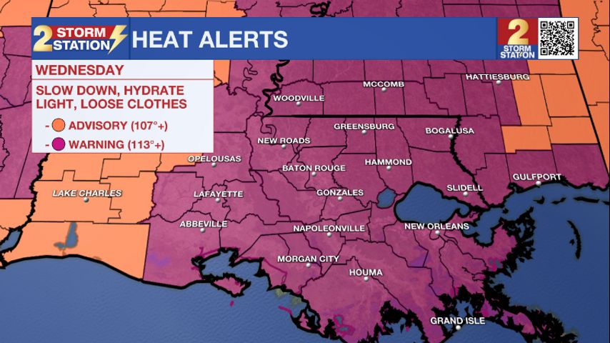An ***EXCESSIVE HEAT WARNING*** is in effect until 7pm Thursday for the entire WBRZ Viewing Area. Dangerously hot conditions with heat index values up to 120 expected. Extreme heat and humidity will significantly increase the potential for heat related illnesses, particularly for those working or participating in outdoor activities. Drink plenty of fluids, stay in an air-conditioned room, stay out of the sun, and check up on relatives and neighbors. Young children and pets should never be left unattended in vehicles under any circumstances. Take extra precautions if you work or spend time outside. When possible reschedule strenuous activities to early morning or evening. Know the signs and symptoms of heat exhaustion and heat stroke. Wear lightweight and loose fitting clothing when possible. To reduce risk during outdoor work, the Occupational Safety and Health Administration recommends scheduling frequent rest breaks in shaded or air conditioned environments. Anyone overcome by heat should be moved to a cool and shaded location.