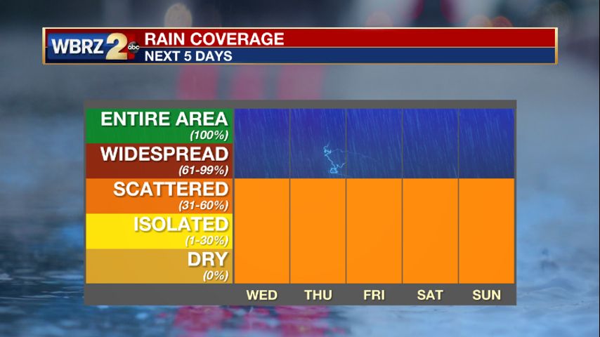 Up Next: Thursday will also bring scattered storms with the majority of the viewing area picking up a shower. Shower activity will start to scale back as we near the weekend. Rainfall totals for the week will be between 1-4 inches with the highest amounts closer to the coast. Isolated higher amounts are expected and there will likely be a few instances of street and poor drainage flooding this week. Overall, the rainfall will be manageable. Thicker cloud cover and rain will help keep temperatures down. High temperatures will trend near 90°, higher for areas that do not see any rain. Click here to see the 7-day forecast.