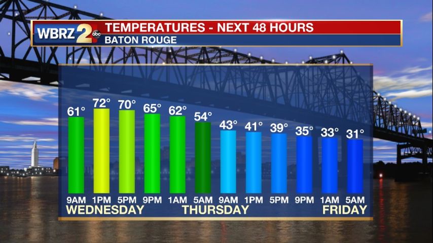 Tonight, a cold front will bring a line of showers and thunderstorms through the area. Most of the rain will be east of metro Baton Rouge by daybreak. One or two storms overnight could be strong, but overall, the severe weather threat is low.