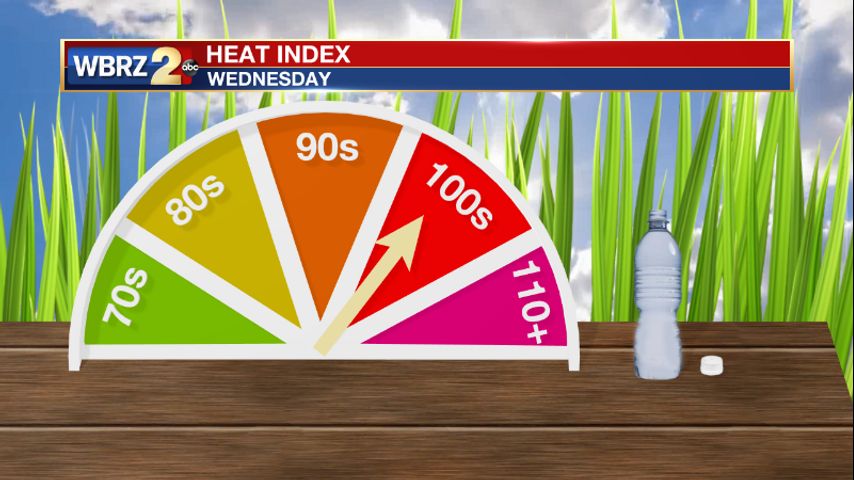 Today & Tonight: Things just keep heating up! Today temperatures will climb to near 95° and the heat index will be in the triple digits from 100-104°. Once again, there will be no shower activity to cool things off today. Temperatures tonight will be in the mid-70s.