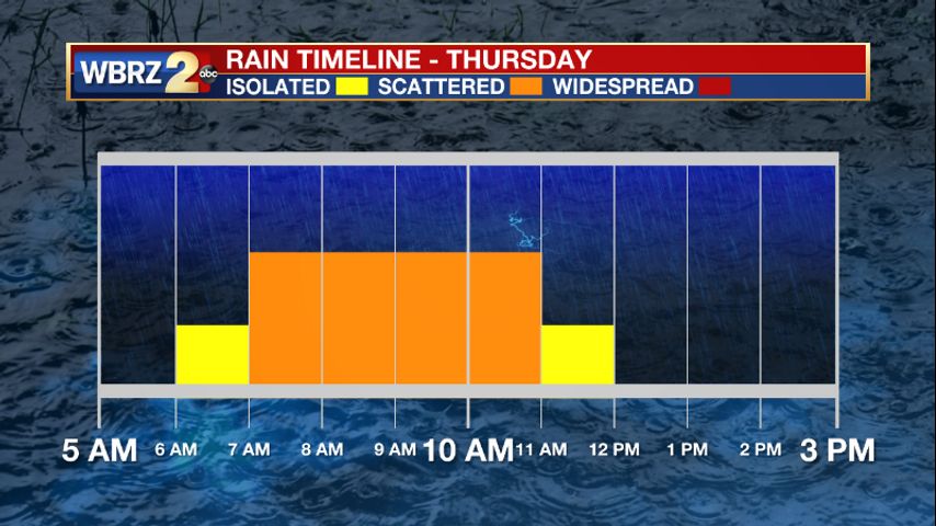 Up Next: Thursday morning will start with gloomy skies and the cold front will start to usher in rain from northwest to southeast. Rainfall is expected to be less than an inch in all areas. As the front falls apart, the showers will too. The areas northwest of Baton Rouge are most likely to catch a shower before it falls apart. By Friday morning, we will be back to the clear skies. Temperatures will be much cooler heading into the weekend with highs in the 60s and overnight lows near 40 degrees. Northern locations will likely dip into the 30s. Click here to see the 7-day forecast.