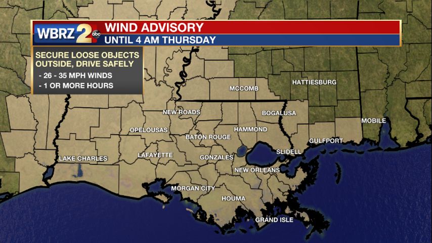Today & Tonight: A wind advisory is out today for all of south Louisiana. Winds will be coming in out of the south sustained from 20-25 mph and gusts up to 40s. Anything loose outside may get blown around, keep an eye on empty trash cans. Temperatures this afternoon will be near 80° and it will be humid. After 8 pm a line of showers and storms will move in from the northwest. Storms will be in and out of the Baton Rouge area by 1 am. You may here a few rumbles of thunder overnight, but storms are expected to weaken as they move east. Watch the full futurecast track here.