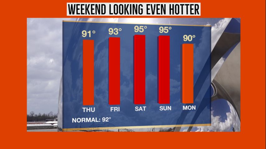 Up Next: Looking ahead to Thursday and Friday the showers and storms will be more numerous in the afternoon, and it may be enough to keep us out of a heat advisory, but it won’t be enough to keep temperatures out of the 90s. The weekend is trending drier and warmer with temperatures near 95 degrees. A heat advisory will be reissued if the triple digit heat is expected to last an extended period of time in the afternoon. The excessive heat pattern will start to break up on Monday as scattered to widespread showers return to the forecast. Click here to see the 7-day forecast.