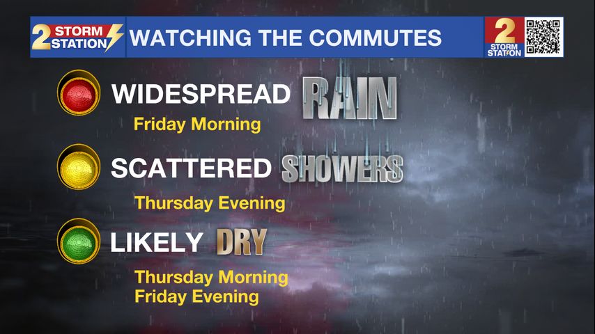 Rain will then end from west to east as the workweek concludes. Colder air will spill back in with northwest winds picking up as the storm system departs to the east. If enough moisture remains trapped in the atmosphere, it is not out of the question that a few sleet pellets or snow flurries mix in as rain ends. However, there would be no impacts from this as temperatures stay above freezing, albeit cold, falling through the 40s during the afternoon.