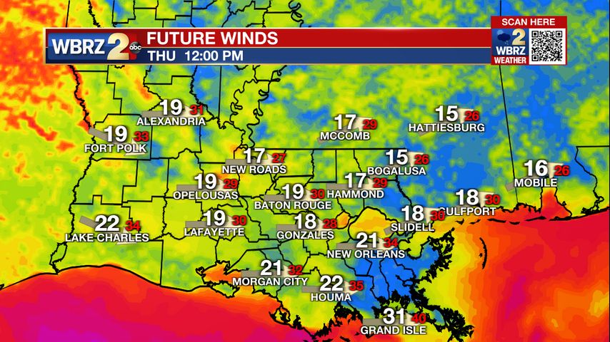 Next 24 Hours: Showers will end early this evening. Behind a cold front, winds will increase out of the west at 10-20mph with some higher gusts. These winds will send low temperatures into the upper 50s by morning. Thursday has a couple of tricky aspects to the forecast. First, the wind will stay elevated all through the day. Expect northwest winds of 15-25mph with gusts possibly over 35mph. Weak tree limbs, above ground powerlines and Halloween decorations could all be affected, so do what you can to secure loose objects. Second, low clouds may develop through the morning and linger for most of the day which could cause high temperatures to stay in the low to mid 60s. When some sunshine sneaks out, more likely south of I-10, a few spots could hit 70 degrees.