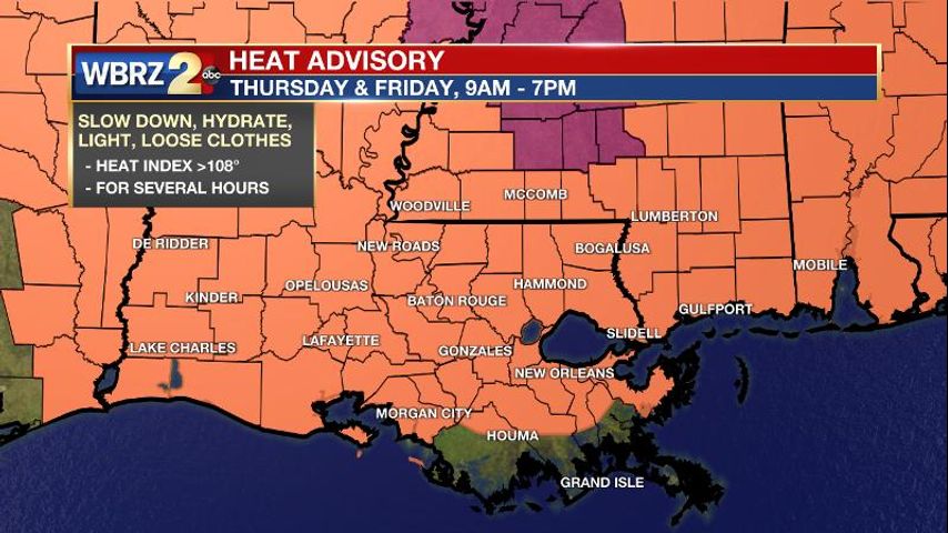 The National Weather Service has issued a *HEAT ADVISORY* for the entire WBRZ Weather Forecast Area through the end of the week. With even higher air temperatures and steadily oppressive humidity expected over the weekend, the bulletins will likely be continued. As a reminder, stay hydrated and try to not over exert during the middle of the day to avoid heat illness.