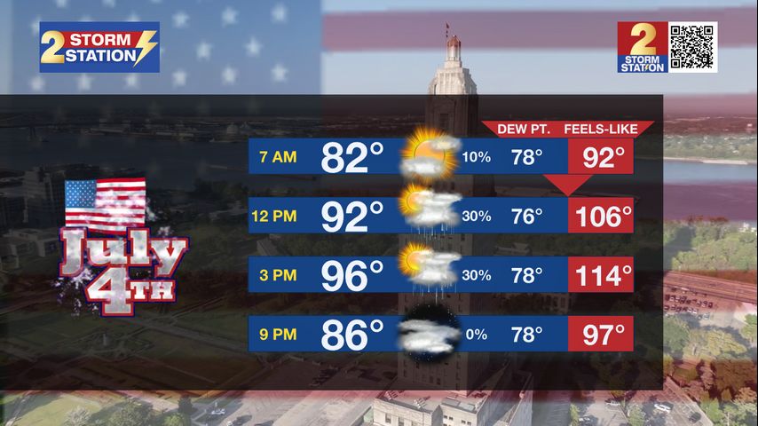 Scattered showers will also be popping in the heat of the day, with roughly 50% of the area seeing measurable rain. By fireworks time, rain should be coming to an end as temperatures fall into the mid-80s. The weather should cooperate for WBRZ's Fireworks on the Mississippi.