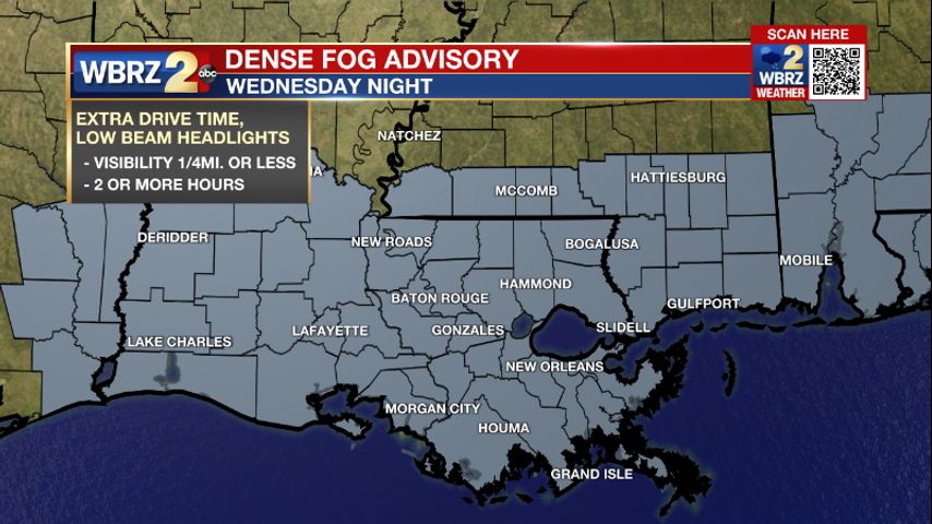 A *DENSE FOG ADVISORY* will be in effect from 9pm to 10am Thursday morning for the entire WBRZ Weather Forecast Area. Visibility could be as low as one quarter mile or less. Hazardous driving conditions due to low visibility should be expected.