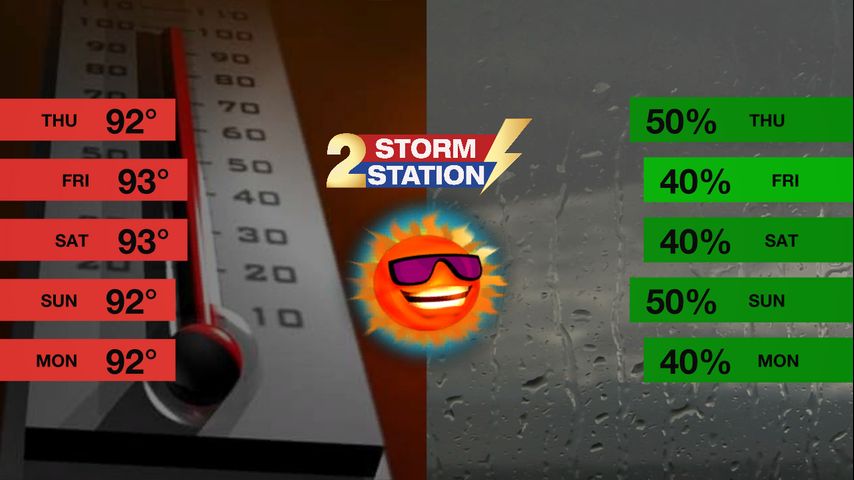 A boost in rain chances should shave several degrees off high temperatures. The potential exists for highs to hit the low 90s beforehand. Despite plenty of humidity, the National Weather Service has decided to hold off on a Heat Advisory for now. Feel-like temperatures may end up peaking slightly under the advisory threshold (108°).