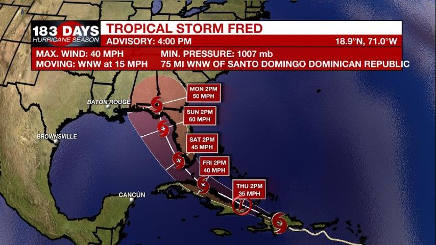 The Explanation: Atmospheric moisture will climb through the end of the week and will combine with seasonable heat and humidity to generate afternoon showers and thunderstorms to develop. Additionally, that humidity will combine with midday high temperatures in the low 90s to produce feels-like temperatures near 105 degrees early each afternoon. Saturday through Tuesday, the pattern will be similar to the previous couple of days with a few subtle changes. Ongoing southeasterly wind flow will add even more moisture to the atmosphere, which will lead to an uptick in the number of showers and thunderstorms that can develop. Another consequence of the added moisture is that some thunderstorms could dump torrential rain in a short time. There could be some isolated instances of street and poor drainage flooding. These warm season storms can always produce frequent lightning and gusty wind as well. Tropical Storm Fred continues to be an item to watch for the local forecast, although it still does not appear to play a major role in our weather. It is currently forecast to make landfall along the northeastern Gulf Coast by early next week as a tropical storm. Regardless of this system, we are steadily approaching the peak of hurricane season, so continue to monitor with us and have a plan in place for in case one comes our way.