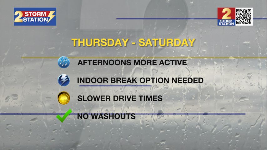 Up Next: Friday will start on a dry note with peeks of sun allowing highs to rise into the middle and upper-80s. A recharged atmosphere will fire more scattered thunderstorms by afternoon. An approaching cold front will sustain off-and-on storms after dark. These will continue into Saturday, where additional clouds and moisture will keep highs near 80°. Again, downpours and a few stronger thunderstorms are not off the table on either day. While not raining at every point, rain gear will be a useful accessory during this timeframe. The cold front will finally pass through late Saturday, sweeping out the moisture.