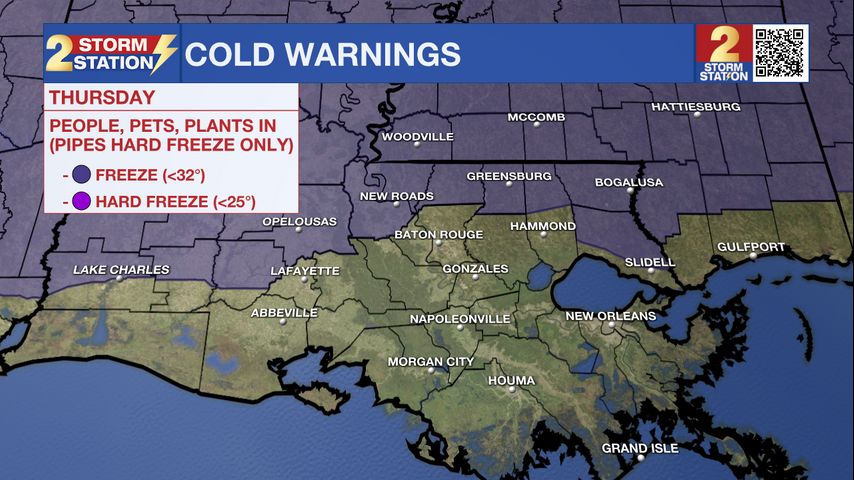 A ***FREEZE WARNING*** is in effect from 1 - 8am Thursday for all of southwest Mississippi and neighboring parishes in Louisiana. Sub-freezing temperatures as low as 32 could kill crops, other sensitive vegetation and possibly damage unprotected outdoor plumbing. Take steps now to protect tender plants from the cold. To prevent freezing and possible bursting of outdoor water pipes they should be wrapped, drained, or allowed to drip slowly. Those that have in-ground sprinkler systems should drain them and cover above-ground pipes to protect them from freezing.