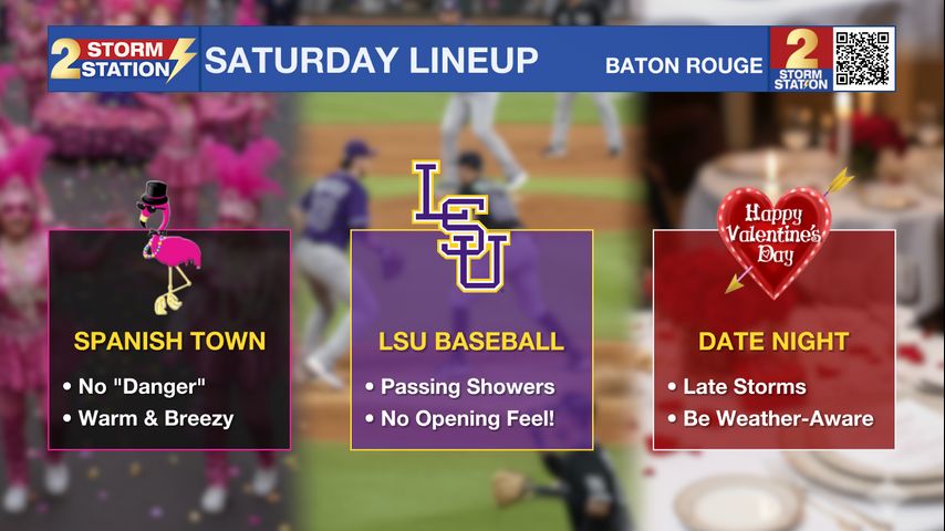 Saturday: Between Valentine’s Day dates, the Spanish Town Mardi Gras Parade, and LSU Baseball’s opening weekend against Milwaukee, there will be a lot happening outdoors. An active weather pattern will accompany the busy calendar. Developing showers during the day will be followed by arriving storms at night. Confidence is growing that storms will arrive after dark.