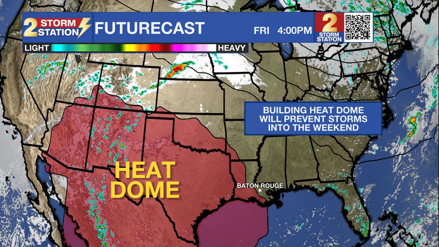 Up Next: The wet pattern we've recently experienced has been characterized by long-lived storm complexes pushing into Louisiana from the Plains. A ridge of high pressure will set up over the south-central U.S. in the coming days, shutting off the development of said storms complexes. The net result will be drier days through the weekend across the capital area. Look for mainly sunny skies Friday through Sunday. Temperatures will be hot with highs soaring into the mid-90s with feels-like temperatures past 100°. While not enough to trigger heat alerts, be sure to drink lots of water this weekend.