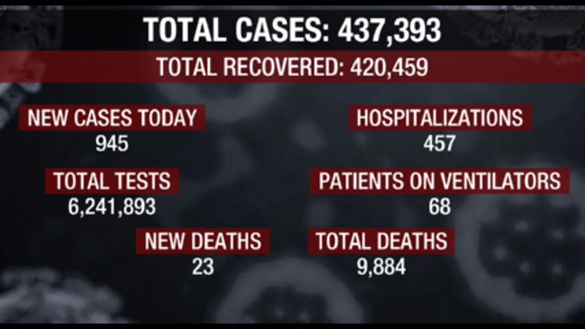 WEEKEND: The state is reporting another 945 cases, bringing the total to 437,393. There were 23 additional deaths bringing the statewide toll to 9,884.