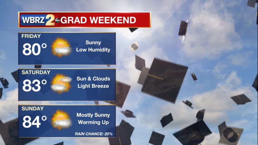 Into Monday, the southerly winds will pump plenty of moisture into our area. Scattered showers will be possible starting on Monday afternoon. We will be stuck in a rainy pattern for all next week with scattered showers expected every day. Stay will the WBRZ Weather team for the specifics as we get closer to next week. Click here to see the 7-day forecast.