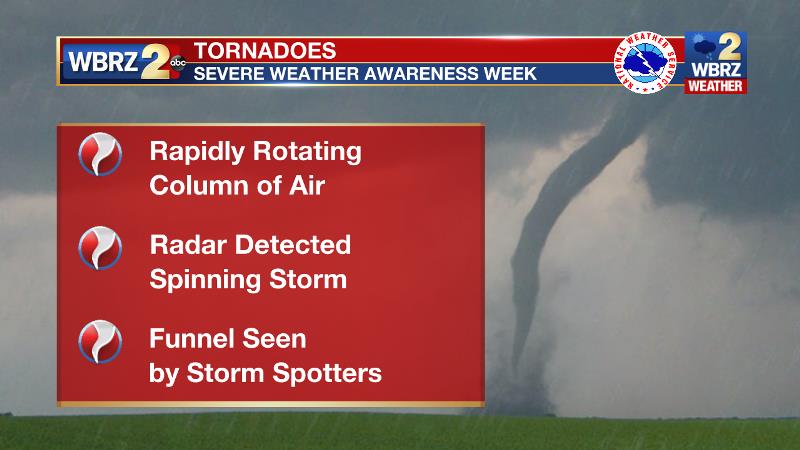 Be Weather-Ready: Check the forecast regularly to see if you're at risk for tornadoes. Check in with WBRZ Channel 2 or a NOAA Weather Radio to stay informed about tornado watches and warnings. Check the Weather-Ready Nation for tips.