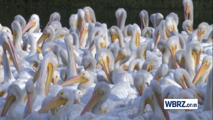 BATON ROUGE - A large pod of white pelicans stopped by the LSU lakes Monday morning.
