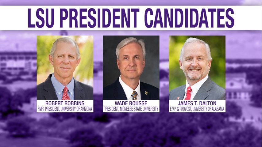 The finalists are former University of Arizona President Robert Robbins, University of Alabama Executive Vice President and Provost James T. Dalton and McNeese State University President Wade Rousse. The board also interviewed LSU Interim President Matt Lee and Dr. Giovanni Piedimonte of the Tulane School of Medicine, but they were ultimately not chosen.