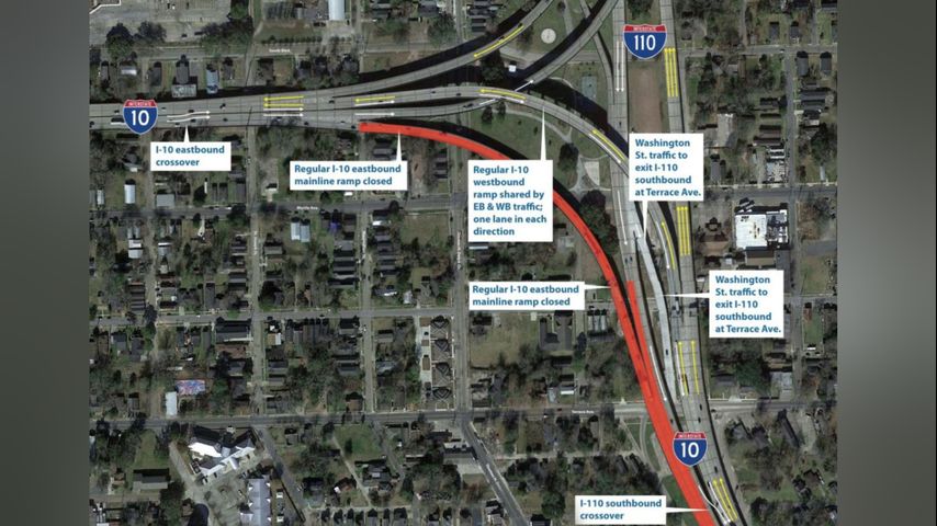 For about 12 months, engineers are being forced to shuffle both directions of traffic into the current I-10 West flyover above Expressway Park. The two-lane flyover moves traffic on I-10 W past the I-110 entrance toward the New Bridge. Once constriction begins, traffic in both directions will be forced to share the flyover, creating just one lane in each direction for about 3,000 feet between the Louise Street exit and the approach of the bridge over the Mississippi River.