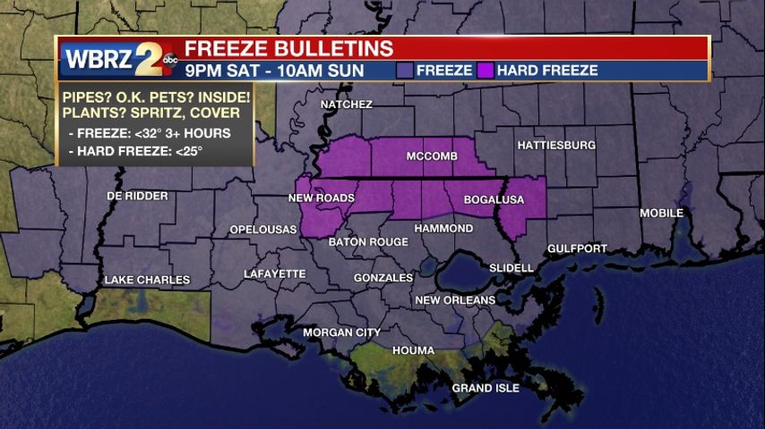 A HARD FREEZE WARNING has been issued for the Florida Parishes and southwest Mississippi where temperatures could briefly reach 25 degrees or lower.