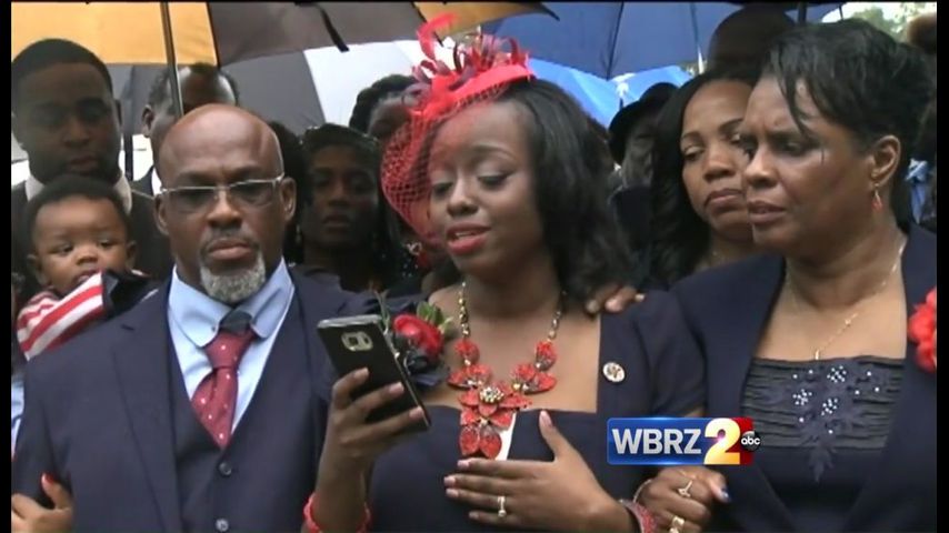 BATON ROUGE - Overcast skies and rain moved through as Montrell Jackson's fellow officers removed his flag-covered casket from the hearse that brought him to his final resting place.