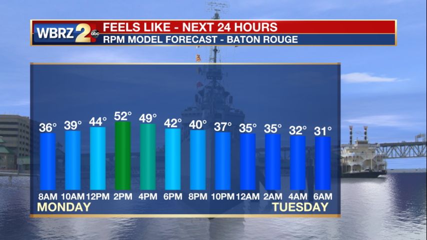 Up Next: Tuesday will be dry with temperatures approaching 60 degrees in the afternoon. Later in the evening, showers and storms will bubble up in western Louisiana. They will push our way in the overnight hours and Wednesday morning we will be waking up to some rain. The rain will clear by the late morning and the rest of Wednesday will be partly cloudy with temperatures in the upper 50s. Dry skies will stick around through Friday with temperatures near 60. Rain is back in the forecast over the weekend. Click here to see the 7-day forecast.