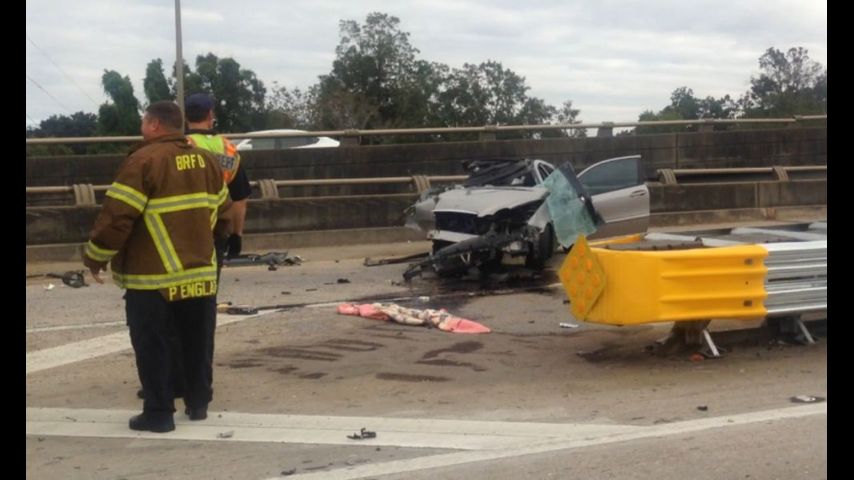 It happened just before 9 a.m. on I-10 East at the entrance ramp onto I-110 North. Baton Rouge Police said a vehicle in front of the big rig and car lost control, and the car's driver swerved to avoid it but ran into the 18-wheeler's tire.