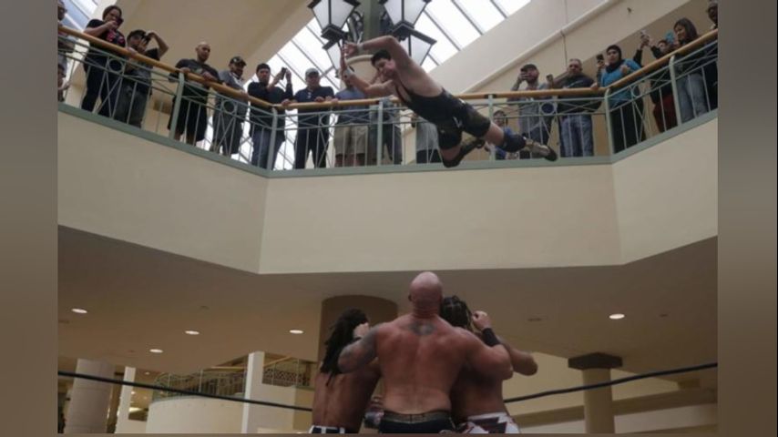 Hawx's flying cross bod stunt involves him jumping from the second-floor guard rails onto three wrestlers, in the ring on the first floor.