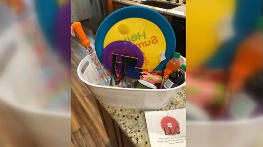 Matthew and Britany Puccini have stuffed baskets with at-home entertainment including card games, sidewalk chalk, water balloons, and bubbles. They even included some of Matthew's woodwork crafts.