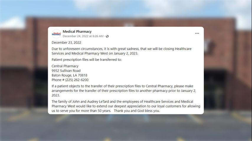 A social media post by Medical Pharmacy, Inc. – on Christmas Eve – directed customers to Central Pharmacy, on Sullivan road in Baton Rouge, where their prescriptions would be transferred following the early 2023 shut-down.