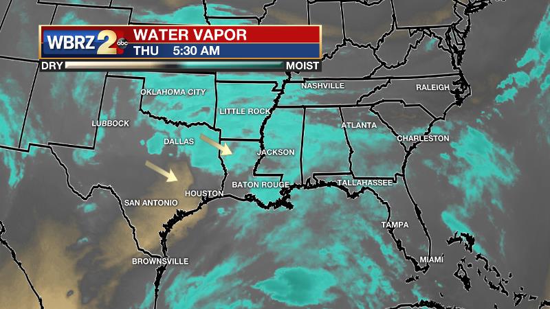 THE SCIENCE: A dissipating surface trough will factor into shower and thunderstorm development through Thursday. A discrete wave, noted on the water vapor imagery, is responsible for the second morning round of rain and storms this week. Once this wave exits east, the latter half of Thursday should be calmer due a rain cooled and briefly stabilized atmosphere. In the absence of these upper disturbances, daytime heating will take over as the key factor in igniting rounds of showers and thunderstorms. Through the weekend, the atmosphere will remain moist and unstable so as afternoon temperatures reach the low and mid 80s, scattered to widespread showers and thunderstorms are expected for the remainder of the week. Precipitable water values in the 1.75 – 2 inch range will be sufficient for locally heavy rain and possibly some nuisance flooding—especially since daily rain has caused saturated grounds and therefore runoff issues. Daily rain coverage will vary through Monday but should not dip below 40 percent for the 13 Parish, 3 County forecast area. At the same time, no washouts are expected. The bottom line is this—during the late spring and early summer, if there is any kind of disturbance from the surface to the upper levels, enough moisture and instability is available for widespread activity like this. An upper level ridge or surface high pressure is ultimately needed to taper the showers and thunderstorms. A cold front is expected to move into the area early next week providing a break from the highly unsettled regime. A slight reduction in humidity appears possible as well.
